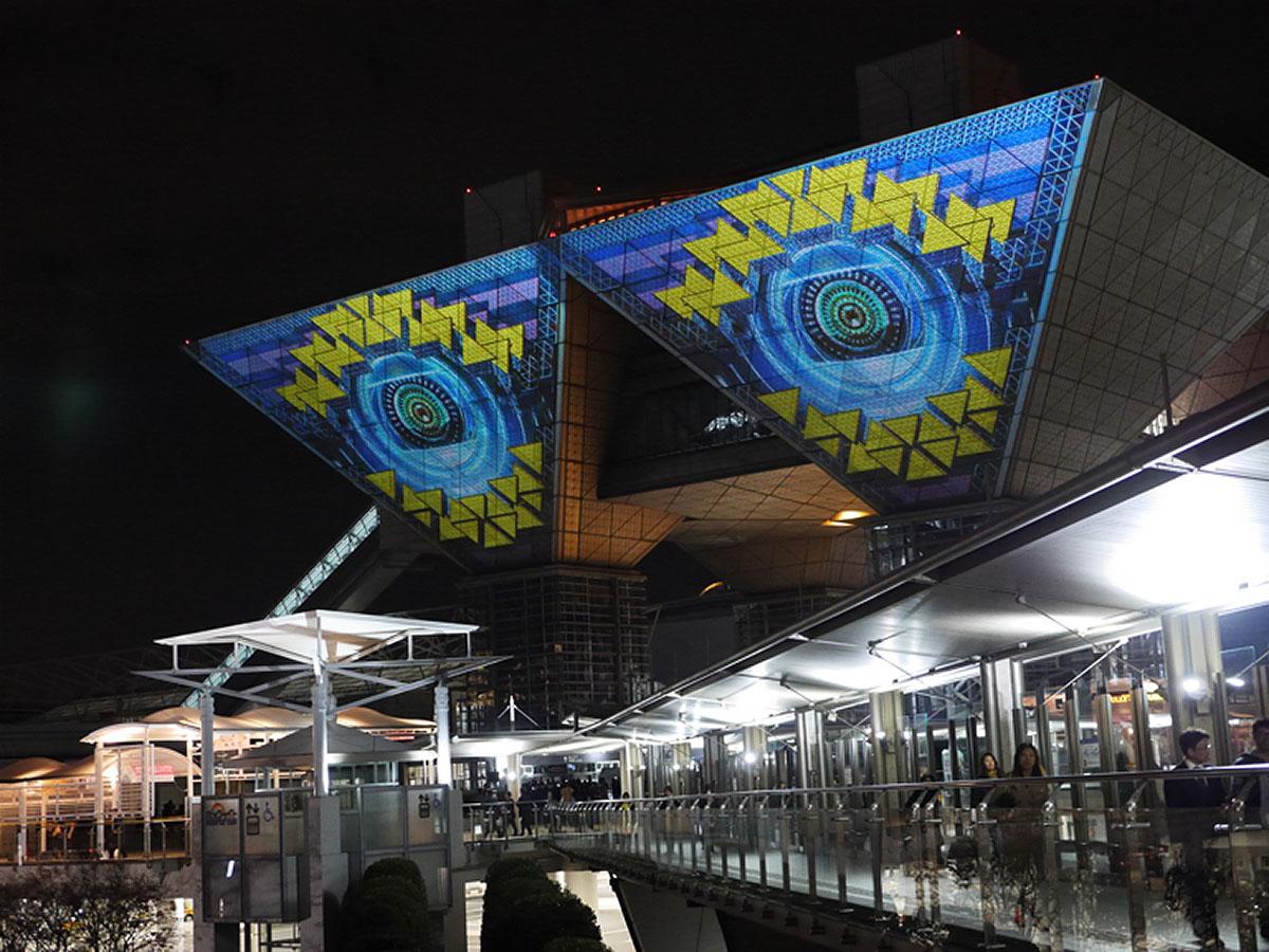 株式会社東京ビッグサイト(国際展示場)様では、有明地区の地域活性化を目的とした新スポットとして、2014年10月末より超高輝度プロジェクター8台を使用した空間演出プロジェクションマッピングを実施しされ、3チップDLP®方式プロジェクターPT-DZ21K、ズームレンズ、音響設備などを導入されました。