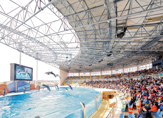 アドベンチャーワールドのマリンライブ「Smiles」は、イルカのありのままの動きやトレーナーの全身のパフォーマンスを存分に楽しめるよう、あえてMCや解説を入れずに演出されています。 ステージ上には大型映像表示装置を設置し、会場内の様々な角度から撮影された映像を映してライブを盛り上げています。 撮影には、以前からリモートカメラが活用されていましたが、塩害や老朽化によりリプレイスを検討。 耐重塩害・耐風圧で、素早いイルカの動きをスムーズにとらえる回転台性能と、天候によって変化する撮影環境にも十分に対応する高画質を評価し、2台の屋外対応リモートカメラAW-HR140を導入しました。 1台は広い会場全体を写すため天井に設置。もう1台はイルカやトレーナーをステージ側から写せるよう大型映像表示装置の真下に取り付けています。 機器選定を担当した運営部の中野様はこう語ります。 「以前は、強風時に映像がブレてしまいリモートカメラを使用できない日がありました。 また、ハウジングケースに入れて設置していたため、雨が降った翌日に冷え込むと結露してガラス面が曇ってしまっていました。AW-HR140はハウジング無しで設置でき、今ではどんな悪天候でも曇っている映像を見たことがありません。 ブレ補正が優れているので風が強くても安心して使うことができています」